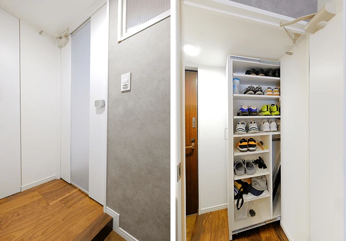 リフォーム前は玄関ドアを開けるとすぐにキッチンに繋がる間取りでしたが、玄関前に小さなホールを設けることで、「家の入口」としての落ち着きを確保しました。靴や小物の収納に便利なスライド式の玄関収納も設置し、限られた空間でも快適に使える工夫を施しました。デザインのアクセントとして室内窓も設置しています。