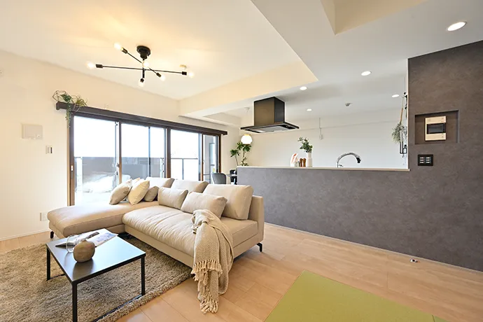 リビング・ダイニングは、インナーサッシを追加して、冬の寒い日も暖かく居心地のよい空間となるようにしました。キッチンのリビング側のクロスはダークグレーのクロスを採用し、リビングの空間のアクセントとなるよう演出しました。