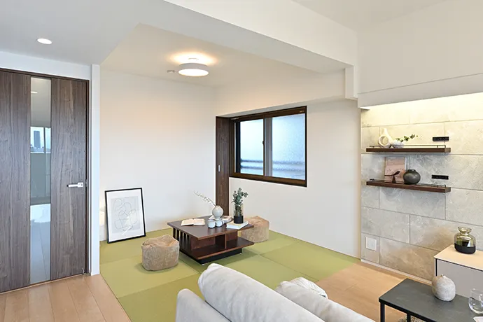 リビング・ダイニングの一角には、Oさまのご要望により畳コーナーを設けました。お子さまが小さなうちは、おむつ替えなどのお世話をする場所という想定で、仕切りを設けず、キッチンからリビング・ダイニング、畳コーナーまでが一続きの移動しやすい空間となるよう配慮しました。また、ご両親さまがお泊まりになる際の就寝スペースとしても利用できます。内装は、基調となる白いクロスに対してダークな色調の建具や棚を配し、一部には石目調のタイルや間接照明を取り入れることで、立体感が感じられる空間にしました。