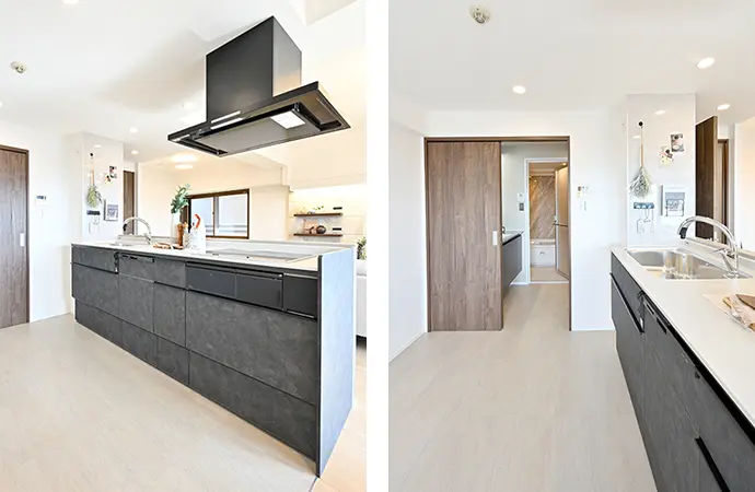 キッチンは、独立型から対面式のオープンキッチンへと変更。キッチンに立ったとき、お子さまから目を離すことなくリビング・ダイニングや畳コーナーが見渡せる配置となるよう配慮しました。また、以前の回遊動線を生かし、キッチンの引き戸を開ければ洗面室を通って廊下に出られる、水回りの移動がしやすい動線を確保しました。