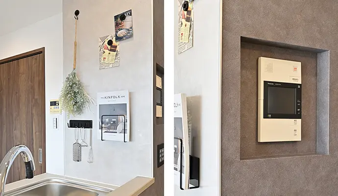 キッチンのシンクの壁面は、調理用具を掛けたり飾り付けが楽しめるようにマグネットパネルを張りました。リビング側の壁は、インターホンの出っ張りをなくすため、ニッチ(飾り棚)を設けて収めるようにしました。