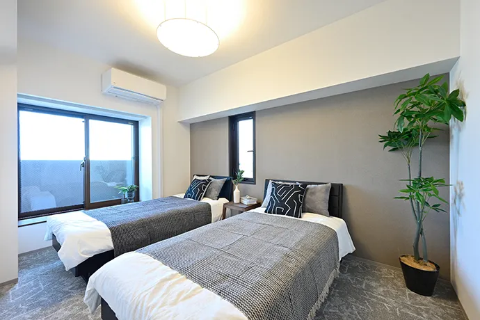 洋室(1)は、ご家族の寝室です。従来あったクロゼットをなくし、ベッドと必要最小限の家具が置ける部屋としてシンプルに仕上げました。アクセントクロスには寝室らしく落ち着いた色合いのグレーを採用。床には部分的に汚れたときに張り替えられるよう、タイルカーペットを採用しました。
