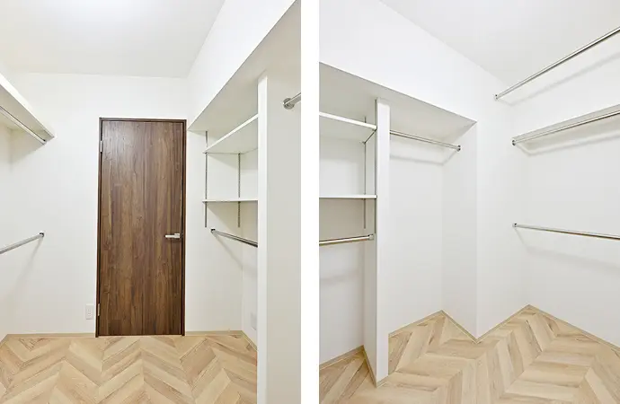 ご家族の衣類を収納できる大型のウォークインクロゼットをご提案。収納スペースを集約したことにより、探しやすく、整理もしやすい使い勝手のよい収納となりました。お手持ちの衣類のサイズや量に合わせ、ハンガーパイプの本数や位置を細かく設定。お子さま用のコーナーとして低い位置に取り付けたパイプや、シーツを広げて干せるよう高い位置に設置したパイプもあります。
