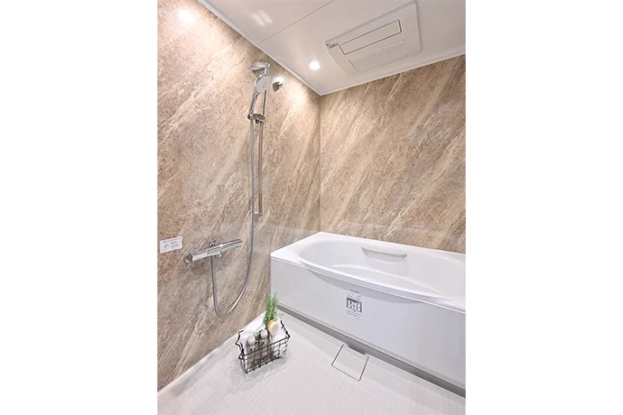 浴室は、「子どもと一緒に入れる広さがほしい」とのご要望に応え、サイズアップしました。また、掃除のしやすさも重視されていたことから、カウンターのないすっきりとした水栓回りを採用。大理石調のアクセントパネルが、空間に動きと奥行きを演出しています。