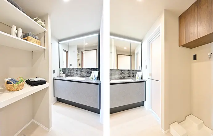 お子さまのご誕生とともに洗濯物が増えることを想定し、洗濯物を畳んだりアイロンがけをしたりするための作業スペースを確保するため、洗面室を拡張しました。新しい洗面化粧台は、既存のものより大きなデザイン性の高いものをご提案し、タイル模様のパネルを採用した製品を選定いただきました。