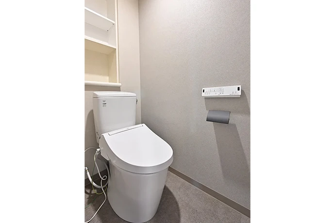 トイレは、既存の棚の色に合わせて白色をご提案しました。クロスは、白が映えるような落ち着いた色合いをお勧めし、その中から、明るいグレーを選んでいただきました。