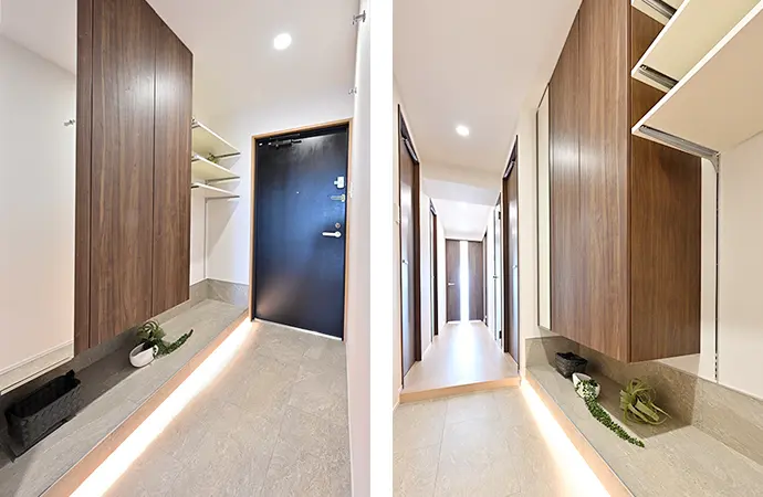 「ベビーカーを折り畳まず玄関ドアの近くに置きたい」というご要望に応えて、玄関スペースを広げ、一部を可動棚として棚の下にベビーカーが置けるようプランニングしました。さらに、収納下の段差を生かした間接照明で、空間に広がりとアクセントを加えました。