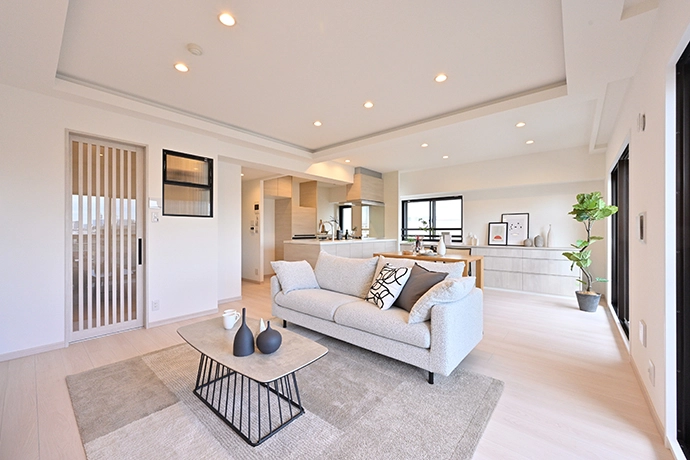 隣接していた以前の洋室(1)をなくして実現した、広々としたリビング・ダイニング。リビングの天井は、ダウンライトに加え、折り上げ天井に間接照明を仕込むことで、空間に広がりと高さを強調しました。柔らかな光が天井面を照らし、圧迫感を抑えた開放感あふれる空間を演出しています。クロスは白、フローリングやキッチンの面材も白系の木目調で色合いを統一した中で、窓枠や建具の引手などの限られた場所に差し色の黒を使い、モノトーンの洗練された空間を演出しました。