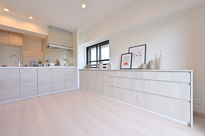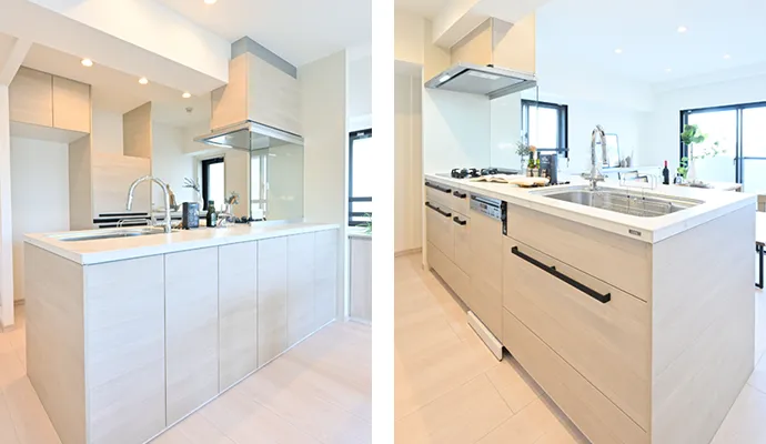 キッチンは、シンク右側にあった収納スペースを窓側に移し、コンロ前面の壁を撤去することで、明るいオープンキッチンに生まれ変わりました。お部屋全体の色調に統一感を持たせるため、カウンター収納やキッチンの面材は、メーカーが異なっても色味が合う製品を選定して採用しました。