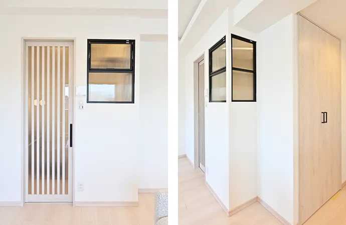 リビング・ダイニングに面して設置した書斎コーナー。以前のウォークインクロゼットを活用し、リビング・ダイニングを広く保ちつつ、独立した書斎コーナーが確保できるよう工夫しました。縦格子のガラス引き戸と室内窓により、リビング・ダイニングの光を取り込むことができます。換気も可能な室内窓は、黒い窓枠をアクセントとしました。