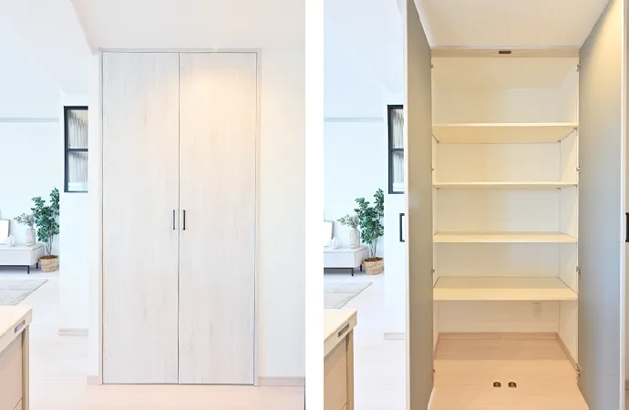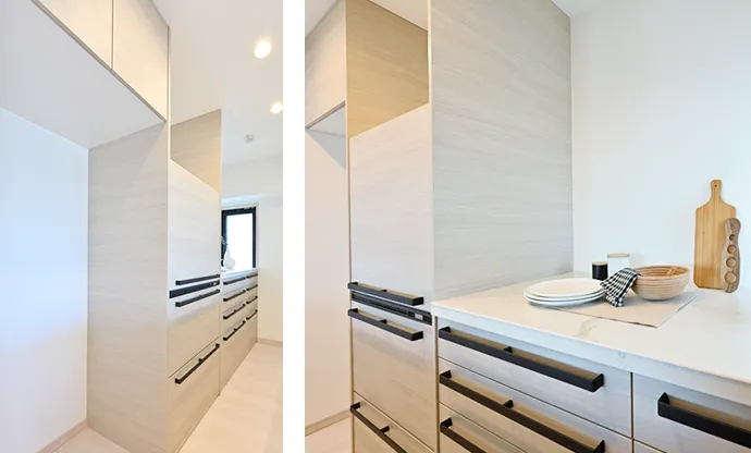 キッチン近くの収納は、高さを調整できる可動棚を取り入れ、パントリーとしても使えるようにしました。