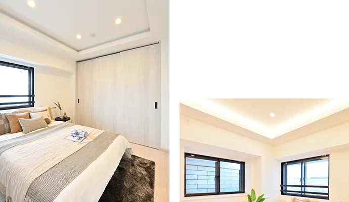 洋室は就寝スペースとして利用するため壁を移動して空間を広げ、クロゼットの位置を変更。扉は引き戸に替え、ベッドをゆったりと置けるスペースを確保しました。天井は折り上げ天井とし、間接照明のやさしい光でくつろげる空間に仕上げました。