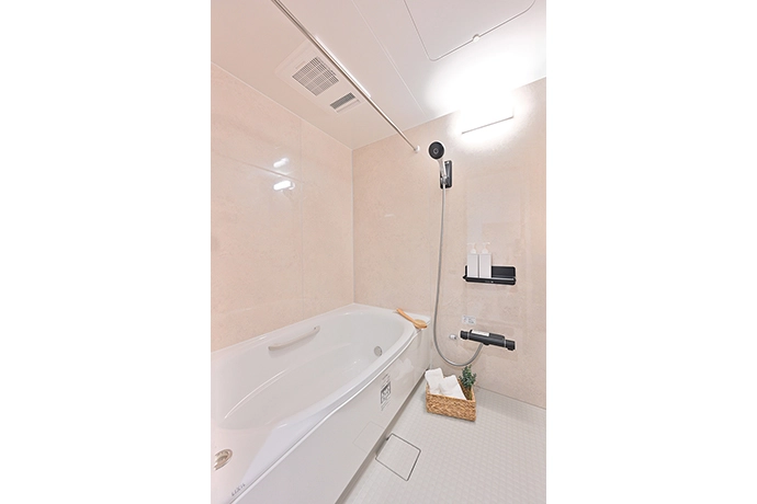 浴室は掃除のしやすさを重視し、壁にはマグネットパネルを採用。小物類は必要に応じて取り付けられる仕様としています。