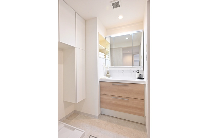 洗面室は、やさしい印象の木目調の洗面化粧台に交換しました。また、洗濯機まわりのスペースを有効活用できるよう、洗濯用品をすっきりと収められる収納を新設しました。