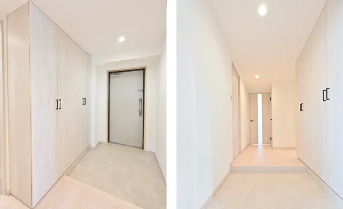 玄関は、吊戸棚と下部収納で分かれていた収納をトール型にまとめ、すっきりと整えました。廊下のクロスやフローリング、建具の色に合わせ土間には薄いグレーのフロアタイルを採用。統一感のある、すっきりとした空間に仕上げました。