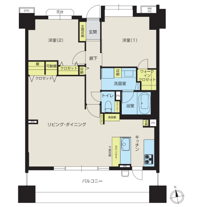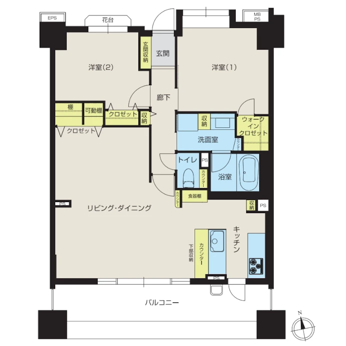 - 洋室収納、リビング収納、家電収納、食器棚、キッチンカンター下収納、洗面室収納、玄関収納
