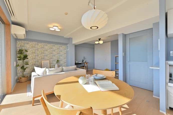 和室をフローリングに変更し、リビング・ダイニングと一体となった開放的な空間にしました。家族全員が快適に過ごせるのはもちろん、愛犬ものびのびと過ごせるよう配慮しています。壁面には植物柄のアクセントクロスを取り入れ、ブルー系で統一。建具も同系色でまとめることで、クロスのさわやかさと自然光のやわらかさが調和し、空間全体に統一感のある、やさしく落ち着いた雰囲気に仕上がりました。