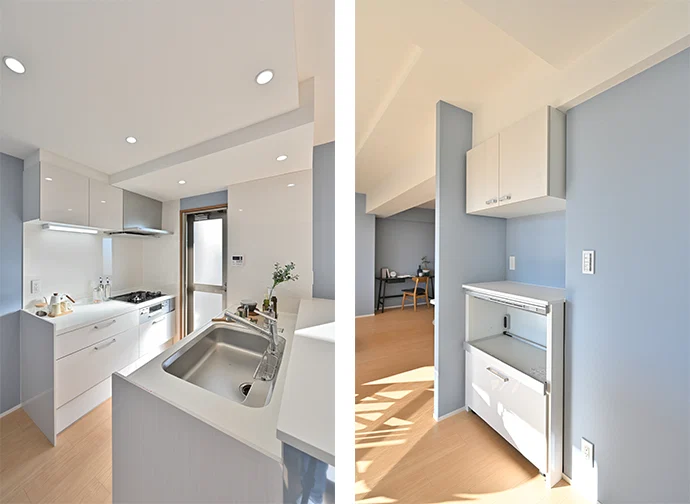 キッチンは、従来の壁付けキッチンから対面式へと変更しました。家電収納を設けるとともに、キッチンカウンターを造作し、ダイニングとのつながりを意識したレイアウトとしています。キッチンカウンターは、水はねを防ぎながら手元が見えにくくなるよう、立ち上がりを高めに設計しました。