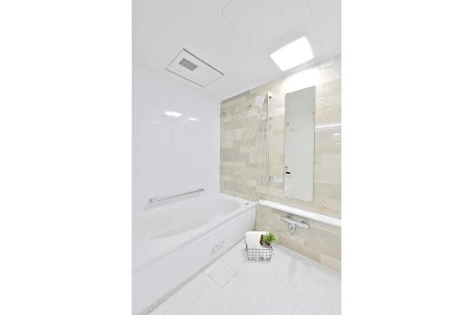 浴室には安全面に配慮し、手すりを設置しました。床はお手入れのしやすい仕様を採用し、日々の掃除の負担を軽減しています。また、アクセントとして石目調のパネルを取り入れ、光の当たり方によってきらきらとした表情を楽しめる、落ち着いた空間に仕上げました。