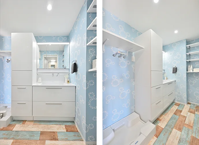 洗面室は、かわいらしい模様のブルー系クロスを採用し、明るくやさしい雰囲気に仕上げました。クロスに合わせて床にはヴィンテージテイストのクッションフロアをご提案し、デザイン性とバランスの取れた空間としています。壁には撥水クロスを用い、水回りでも安心して使える仕様としました。収納は壁面に可動棚を設け、使い勝手に合わせて調整可能に。最下段には洗濯かごを置けるスペースを想定し、日常動線にも配慮しています。また洗面台は以前のものより幅を抑え、その分トール収納を新たに設けることで、収納力と使いやすさを高めました。