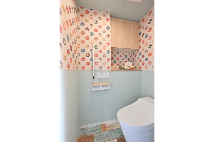 トイレは洗面室とテイストを揃え、ヴィンテージ感のあるクッションフロアを採用しました。壁には消臭効果のある撥水クロスを使用し、快適さとお手入れのしやすさの両立を図っています。収納は扉の表面に木目調のシートを貼り、空間にやわらかな温かみをプラス。あわせて収納カウンターや手すりも新しく交換し、使いやすさとデザイン性を高めたトイレ空間に仕上げました。