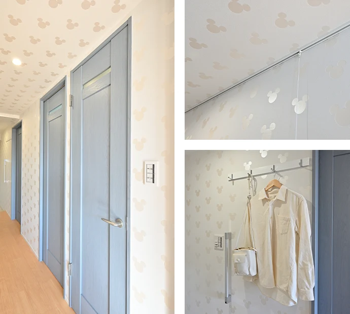 廊下は、壁面と天井のクロスを、素材感がきらきらと美しく映えるお好みの柄へと変更しました。光の当たり方によって表情が変わり、通路の空間にも華やかさを感じられるようになりました。