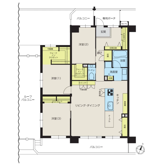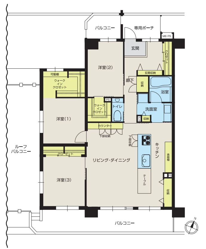 - 洋室収納、ウォークインクロゼット、食器棚、キッチン収納、廊下収納、玄関収納、ダイニングテーブル