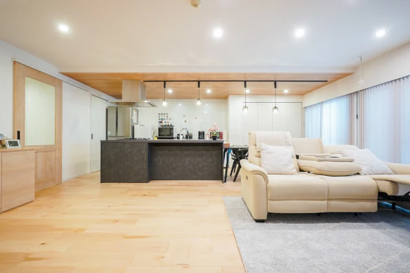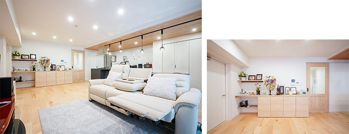 リビングはゆったりくつろげるよう、余計な家具は置かないようにしました。今ある大きな仏壇を将来、モダンでコンパクトなサイズに買い換えられることを想定し、カウンター収納と棚を設置。普段はパソコンが使えるファミリーコーナーとしても利用できます。インテリアは白を基調にフローリングや建具は自然な木目が美しい、ナチュラルなトーンに統一しました。