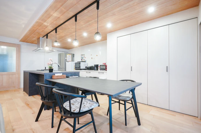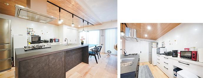開口部が狭く暗かったキッチンからアイランドキッチンに変更。リビング・ダイニングと一体となって明るく解放的になりました。天井は木目の化粧板(不燃性)をアクセントに採用しました。日ごろお子さま家族がよくいらっしゃるので大人数の食事を用意することが多い奥さま。お持ちの食器類やストックする食料品も多く、収納スペースの確保にお困りでした。そこでまず、食器の量や大きさを測って収納プランを検討し、家電調理器も使いやすくレイアウトできるように、カウンタータイプの食器棚をご提案、壁面はマグネットパネルを採用。また、食料品ストック用の冷凍庫も設置できるプランとしました。