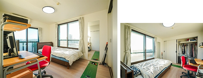 洋室(3)はご主人の寝室になります。お仕事で部屋にいらっしゃることが多いので白を基調とした明るい部屋にしました。以前、和室の時にあった押入と床の間をクロゼットにしてご主人さまの洋服や荷物が十分に収納できるスペースを確保。ゴルフパターの練習もできるよう姿見も設置しました。