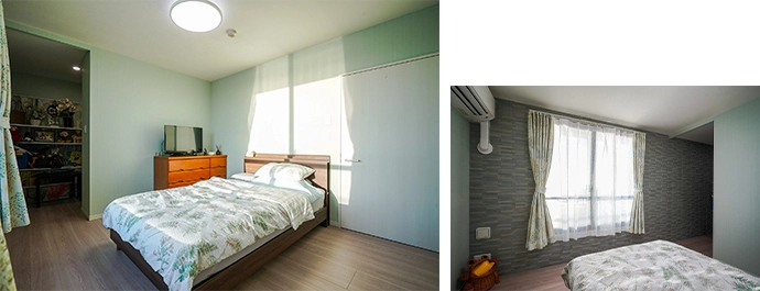 洋室(1)は奥さまの寝室です。ご家族それぞれ生活リズムが異なるので「テレビは一人でゆっくり見たい」というご要望をかなえるためテレビボードが置けるスペースを確保しました。また、趣味のフラワーアレンジメントやその道具、そして着物や洋服を多くお持ちだったので以前のスタディルーム(納戸)とウォークインクロゼットを一つにまとめて、収納だけでなく趣味の作品などを飾れるスペースも確保したウォークインクロゼットを提案。寝室のアクセントとして、窓側の壁面にはボーダー柄の調湿建材を採用しました。