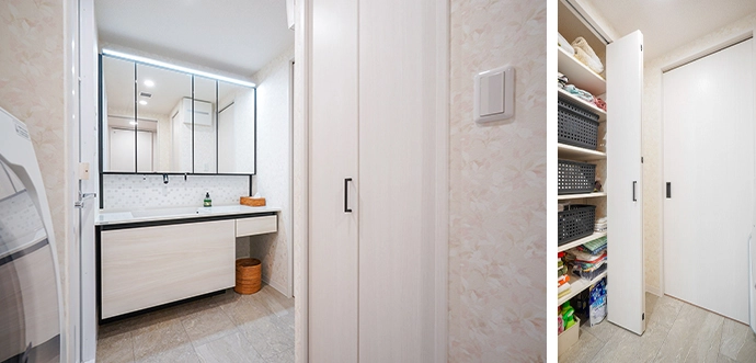 浴室はサイズダウンして洗面室と配置を変更し、キッチン~洗面室~浴室の水回りの使い勝手がよい回遊動線を実現。また、水回りの配置を変更したことにより廊下側に新たに収納スペースを設けることができました。