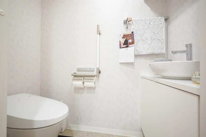 トイレは、洋室(2)のウォークインクロゼットを広げるために便器の向きを変えタンクレストイレと手洗い器を採用。また、水を流す音が響かないよう壁に防音材を充填しました。洗面室同様、廊下が二重床になったことにより、洗面室と同じく段差が解消されています。