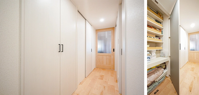 廊下には、水回りの配置を変更したことで奥行きのある収納を確保。元々和箪笥にしまってあった着物などを収納するスペースとしました。和箪笥を部屋の中に置く必要がなくなったので、もしもの地震の際にも和箪笥が倒れる心配をせずにお過ごしいただけるようになりました。
