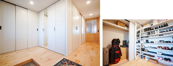 玄関は以前あった洋室(3)を無くし拡張しました。2面の壁一面に下足入れとしての大型の玄関収納とゴルフバッグや大きな荷物をしまうスペースとして生まれ変わりました。また、玄関に窓ができたことで、開放感のある広々とした空間となりました。