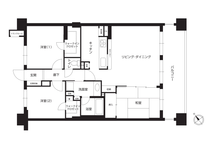 洋室(1)と洋室(2)から独立させてまとめたウォークインクロゼットは、廊下から直接出入りできる設計にしました。家族全員が使いやすいように動線を考慮し、以前よりもスペースを広げたことで、衣類や季節用品、掃除用具などを収納できる空間となりました。