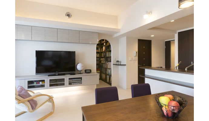 リビング・ダイニングをはじめ、居室の床は白いフローリングを採用。併せて床・壁・天井も白基調とし、梁やTVボードに間接照明を取り入れることで、より天井の高さが感じられるよう演出しています。TVボードと上部の収納は収納力を高め、リビングに収納家具を置くことなくすっきりと暮らせるようご提案しました。