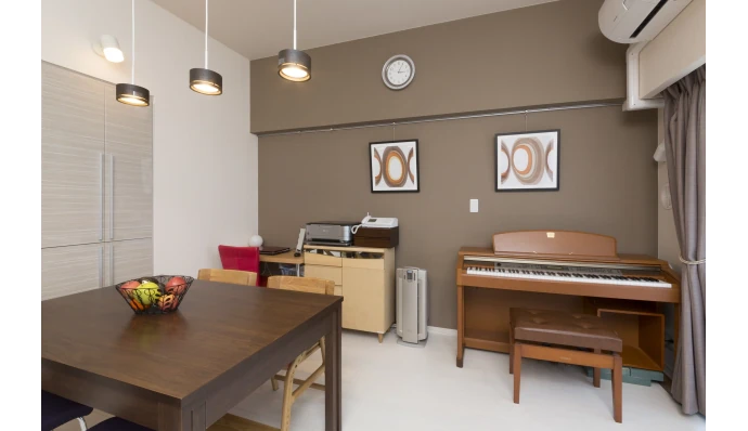 ダイニングの壁には木調の家具やピアノに調和する茶系のアクセントクロスを採用。ピクチャーレールを設置することで、絵画などを飾る楽しみも広がりました。