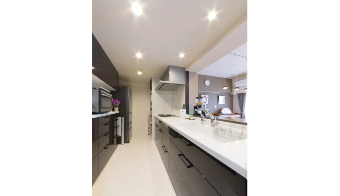 以前のお住まいは4人家族が快適に暮らすには少々狭く、2人のお子さま各々に子ども部屋を確保することも難しかったというSさま。住み替えを検討されるなかで、本物件と出会い、希望どおりのリフォームができるなら購入したいとのご相談でした。そこで、弊社はご夫妻の寝室と2つの子ども部屋を確保した上で、それぞれの居室にあったウォークインクロゼットや押入を一つにまとめ、家族全員が使いやすい形とするプランをご提案。さらに、洗面室や浴室も従来より広く使えるようにしました。また、床の色をダークブラウンから白に変更し、ダウンライトやペンダントライト、間接照明を組み合わせた照明計画で空間の高さや広がりを演出するなどの工夫によって、広々としたゆとりを感じられるお住まいとすることができました。