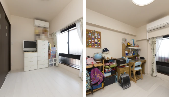 洋室(1)と洋室(2)は、二人のお子さまそれぞれの個室として、床材とクロスを新しくしました。洋室(1)はウォークインクロゼットに隣接しているため、あえて室内には収納スペースを設けず、すっきりとした空間を確保。洋室(2)のウォークインクロゼットは通常のクロゼットに変更し、どちらの空間も広さと使いやすさのバランスが取れた快適な個室となりました。