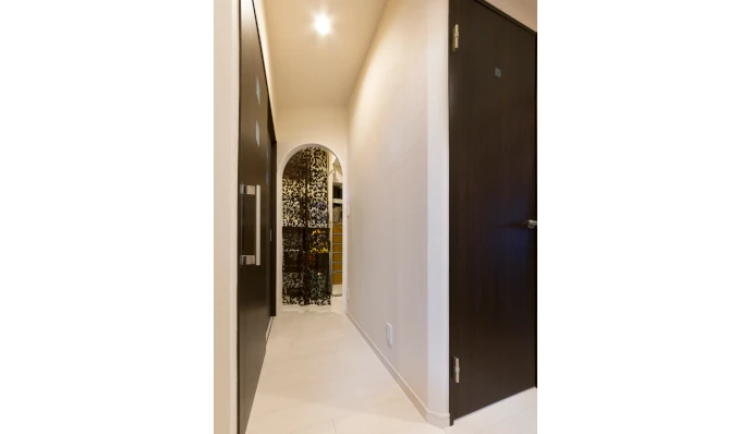 玄関は、トールタイプとカウンター付きの玄関収納を組み合わせ、収納力を向上させました。新しくした石目調のフロアタイルを玄関収納下部の間接照明が柔らかに照らし、空間の広がりとシックな雰囲気を演出しています。