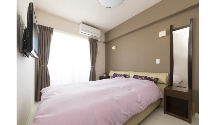 洋室(3)はご夫妻の寝室として使用されるため、以前の可動間仕切り(襖)を間仕切り壁に変更することでプライバシー性を高め、より落ち着いて寛げる空間へと整えました。限られたスペースを有効活用するため、壁掛け式のテレビを設置し、すっきりとした快適な寝室にしました。
