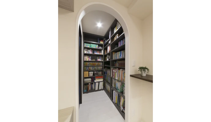 もともと和室の押入だったスペースを、家族全員が利用できる書庫へと改装しました。本に囲まれた隠れ家のような雰囲気があり、Sさまのお気に入りの空間となっています。
