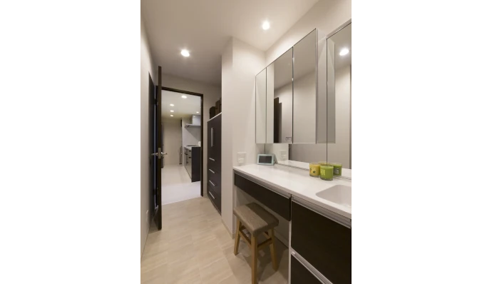 洗面室と浴室の位置を入れ替え、キッチンから洗面室までを一直線につなぐことで、動線をスムーズにしました。また、洗面室は家族4人が同時に使えるよう、従来より広くしています。横長の洗面化粧台を採用し、三面鏡の前には大きなカウンターを設けることで、メイクや身支度を快適に行える空間にしました。
