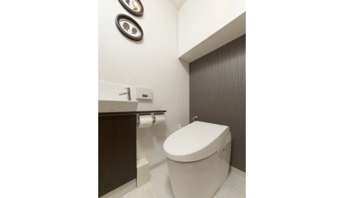 トイレはタンクレスに変更し、新設した収納付きの手洗いカウンターには、掃除道具なども収めることができるようになりました。