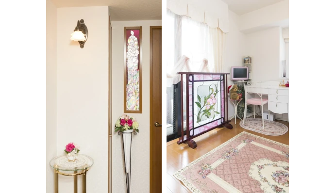 ステンドグラス制作やフラワーアレンジメント、ヨーロッパの伝統技法である手彫りガラス工芸など、多彩なご趣味をお持ちの奥さま。そこで、リビング・ダイニングには奥さまの作品を飾り、壁面には恩師が制作されたステンドグラスを設置しました。