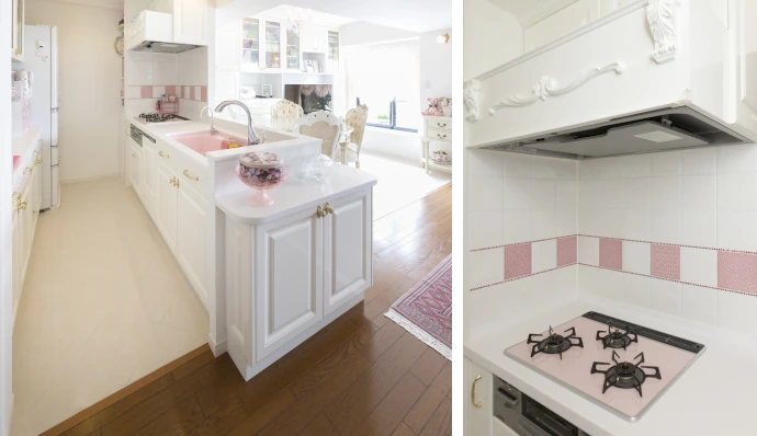 独立型で暗かったキッチンは、オープンキッチンに変更。白、金、ピンクを使用したオーダーメイドのデザインキッチンに変更しました。エレガントなデザインの輸入タイルやレンジフードの飾りなど細部にヨーロピアンテイストを取り入れています。また、キッチンとダイニングの床には、大理石調のタイルを採用することで、一体感のある空間を演出しました。