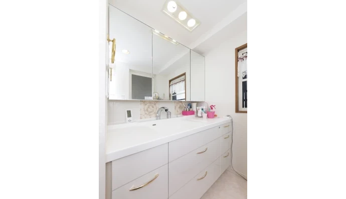 洗面室は、イスが入るカウンター型だった洗面化粧台を、横幅いっぱいに引き出しが付いた新しいものに交換することで収納力を向上させました。鏡下の壁面に植物柄のタイルを張ることで、クラシカルな雰囲気を演出しました。