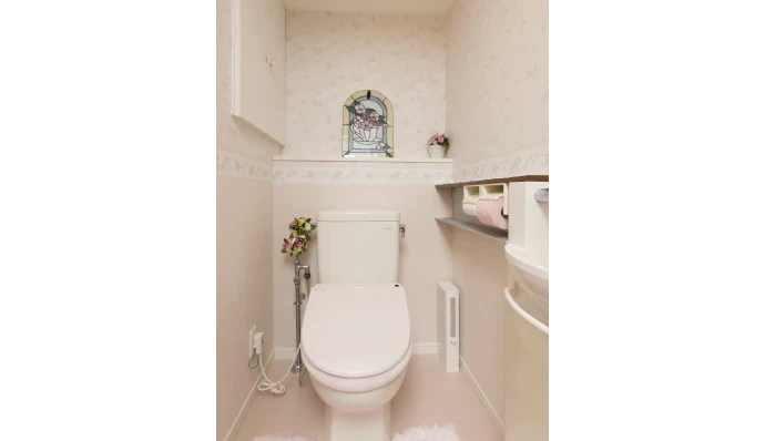 トイレは、バラ柄のクロスに張り替え、CFシートを新調して淡いピンクに統一。柔らかな雰囲気の空間としました。