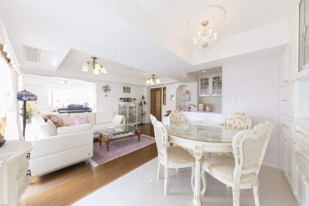 以前の洋室(2)をなくすことで、拡張したリビング・ダイニング。白を基調とした広々とした空間に、金色の取っ手やシャンデリア、ピンクの小物を配置することで、華やかさと可愛らしさを兼ね備えた雰囲気を演出。さらに、TVボードやアーチ型の棚を設置し、収納スペースも充実させました。